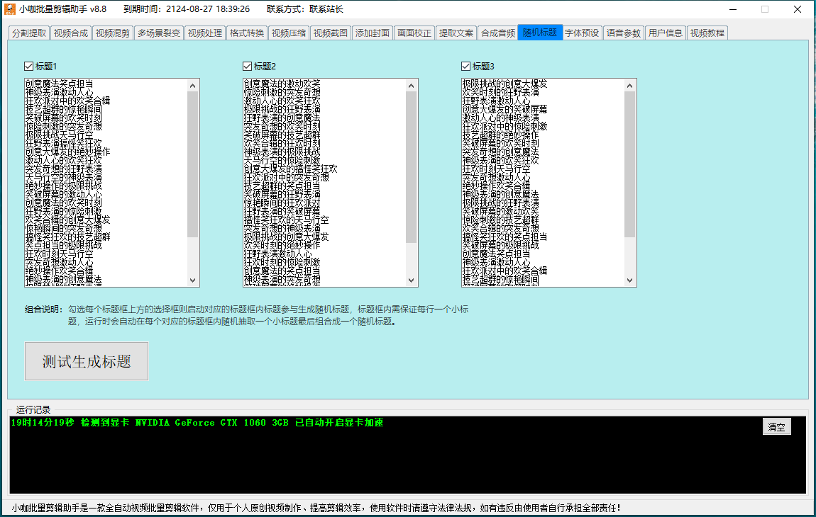 8. 随机标题:本功能为其他功能内视频导出名称的预设功能,可以预先设置并勾选组合成为随机标题的文字