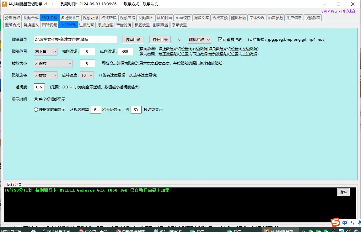 加右边人物视频:使用贴纸功能,设置好对应的参数,设置好视频时长,开始第一次混剪。