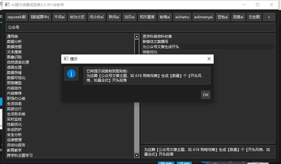 支持扩充:用户可以根据自己的需求,自行扩充提示词内容,让工具更贴合个人使用习惯。
