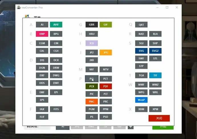 AI, AVIF, BMP, BMG, CGM, CIN, CAL, CG4, DIS, DCX, DGN, DRW, DXF, DWG, DDS, DWF,EMF, EPI, EPS, FAX, FITS, FLIF, GBR, GIF, HRU, ICO, JP2, JPG, JXR, MIF, MTV, PLC, PCT, PCX, PDF