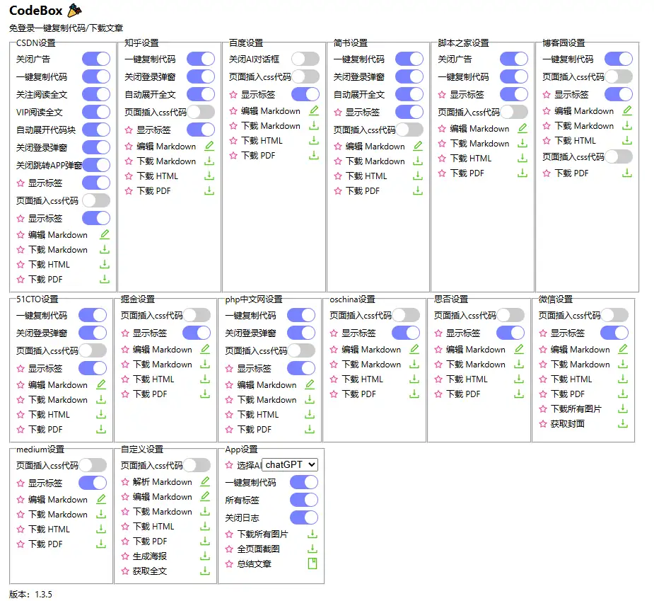 - 支持免登录、一键复制代码、关闭广告、关注阅读全文、自动展开代码块、关闭登录弹窗和下载等操作