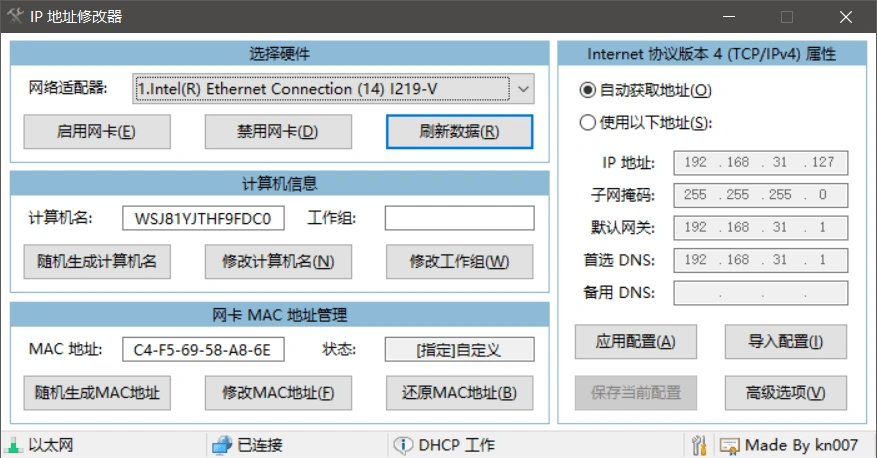 - 如其名,可以方便的进行IP地址,网卡MAC等修改,支持多网卡,并且支持管理导入多份配置,同类工具中的翘楚。