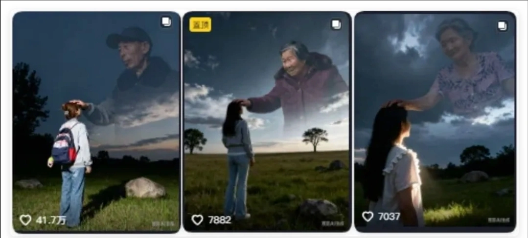 • 用AI修复老照片,让老照片动起来,半透明人托梦等AI制作来寄托思念。最近一组 AI 合成的去世亲人摸头照片在抖音获得 41.7万点赞。